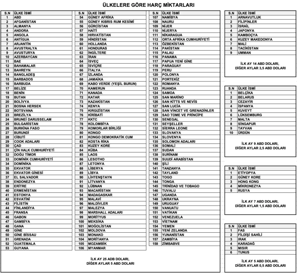 Her grup için farklı ikamet harcı formülü uygulanır; bazı ülke vatandaşlarından vize harcı alınmazken, bazı ülkeler için sabit USD tarifesi uygulanmaktadır.